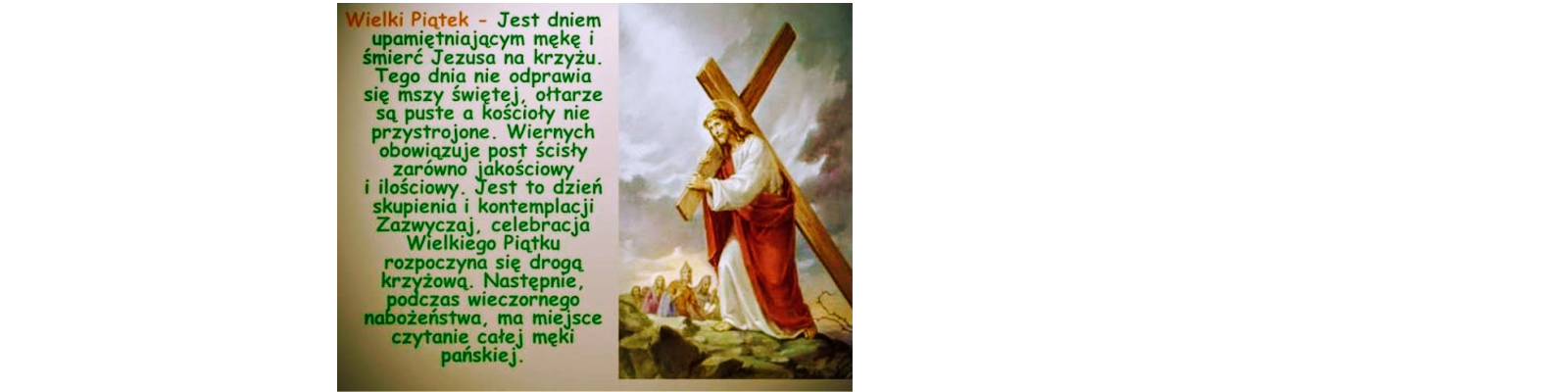 Zapraszamy Parafian i Gości : WIELKI PIĄTEK- 3 kwietnia : • godz. 13:30 plenerowe nabożeństwie Drogi krzyżowej, które odbędzie się w Wimmentall. Adres: 74189 Weinsberg, Ortsteil Wimmentall – Hölzernerstrasse 26. SZCZEGÓLNIE PROSIMY O UDZIAŁ NASZE KOCHANE DZIECI , MINISTRANTÓW I MŁODZIEŻ. • godz. 19:00- LITURGIA na cześć MĘKI PAŃSKIEJ oraz Adoracja przy Bożym Grobie ( prosimy o nie opuszczanie Kościoła zaraz po Liturgii a pozostanie na osobistej Adoracji ). W tym dniu obowiązuje post ścisły, czyli wstrzemięźliwość od pokarmów mięsnych i tylko jeden posiłek do syta. Okazja do SPOWIEDZI ŚWIĘTEJ w HN: * W Wielki Piątek : - od godz.13:30 - podczas drogi krzyżowej w Wimmental - od godz.19:00 w czasie liturgii oraz Adoracji * W Wielką Sobotę: - od godz.10:00 podczas świecenia pokarmówi